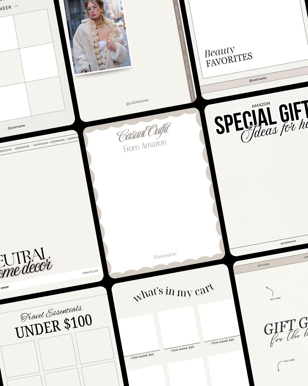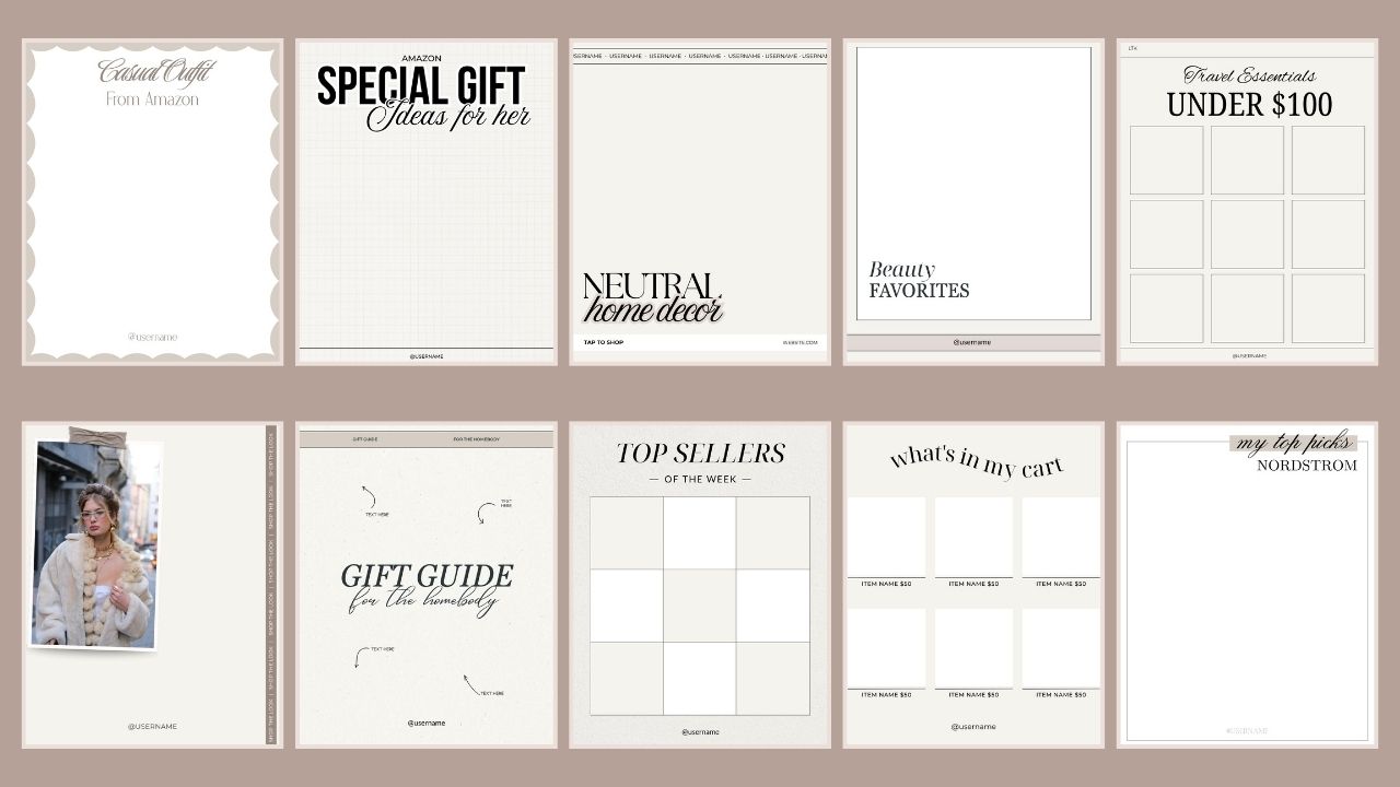 Our Template System gives you access to ready-to-use Canva templates designed for affiliate content. Simply choose a layout, add your products, and customize it to match your brand — making content creation fast, consistent, and professional across LTK, Amazon, and ShopMy. You’ll receive 10 starter templates immediately, plus 1-2 new templates added every month.